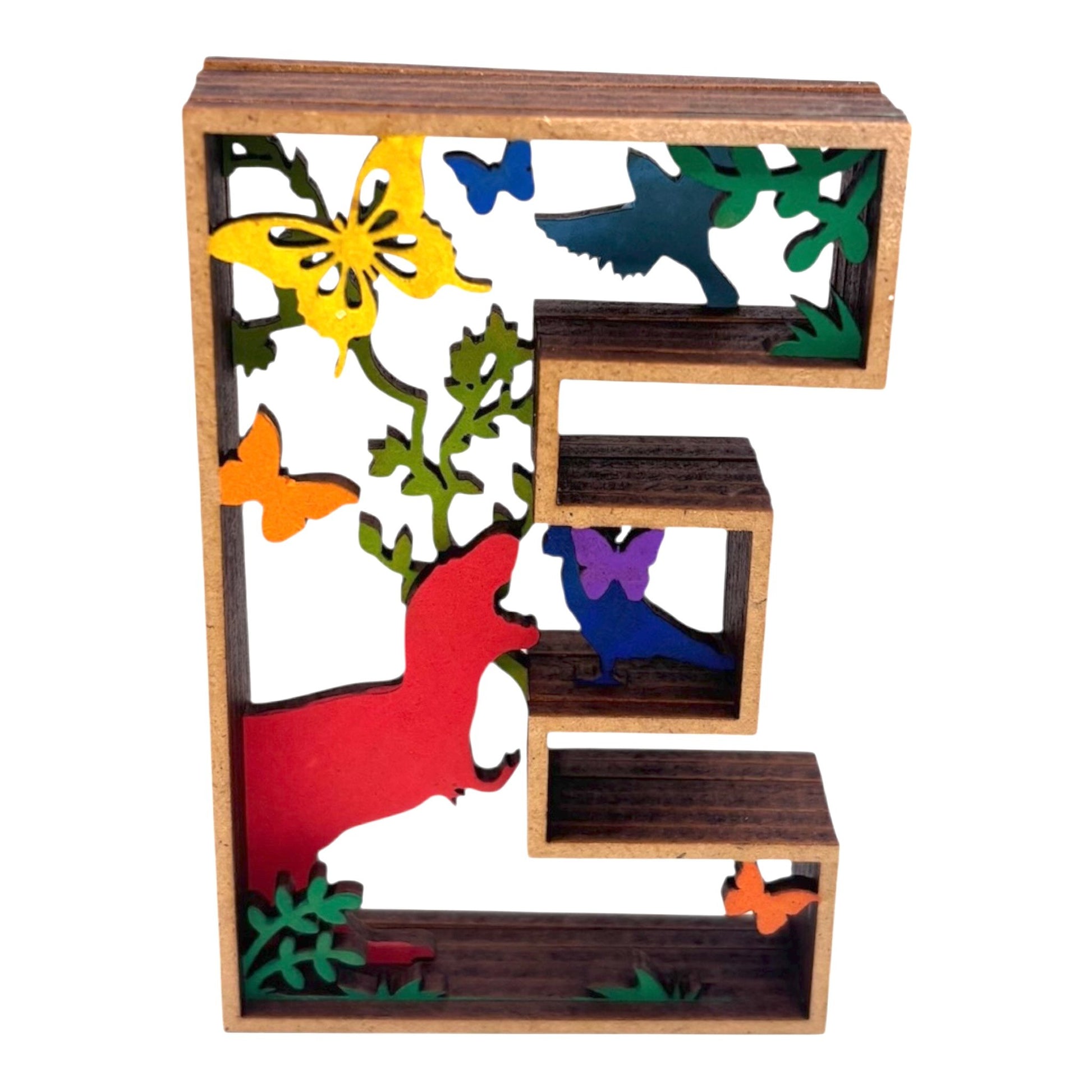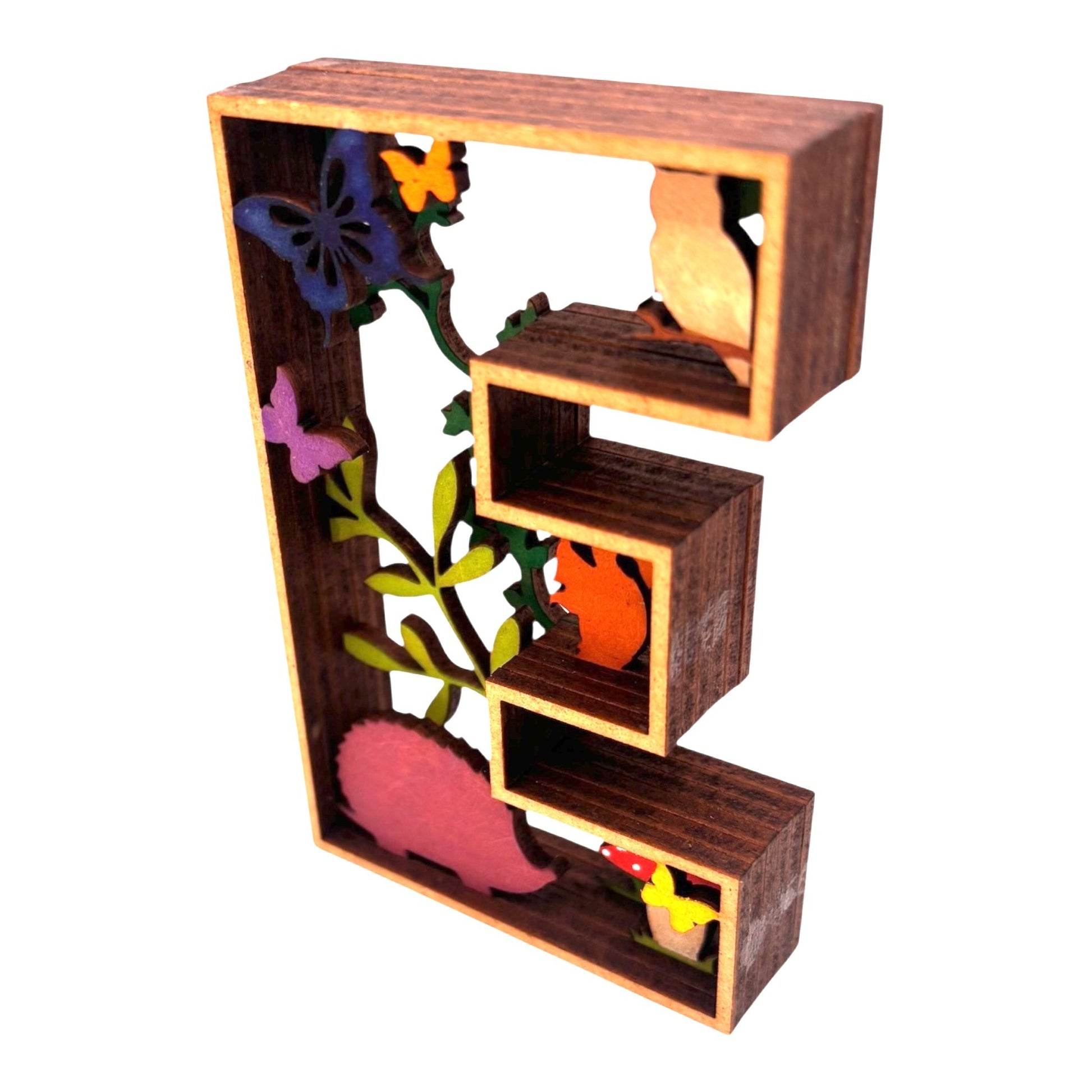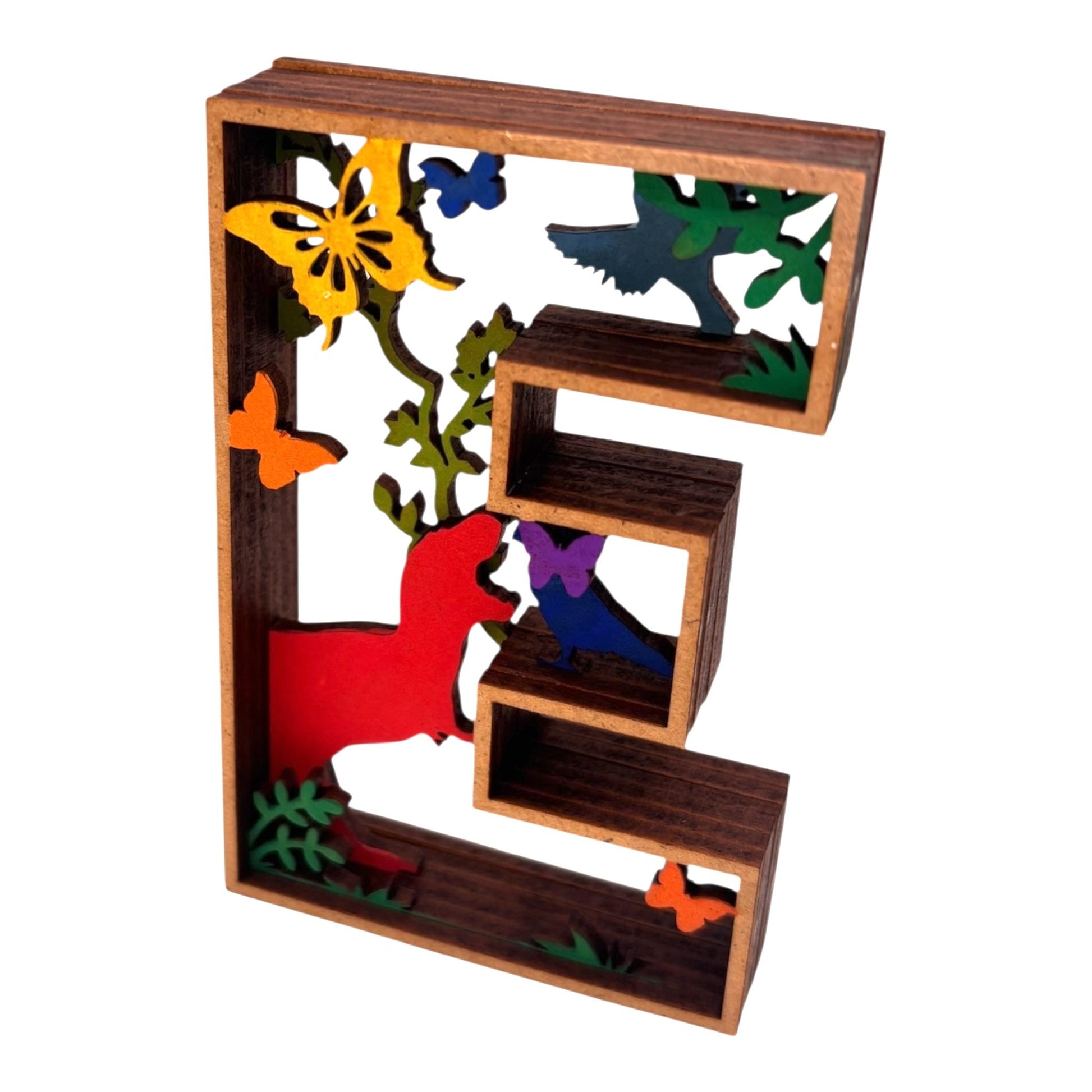 Apportez une touche originale et artistique à votre intérieur avec cette décoration en forme de Lettre "E". Un véritable diorama en 3D, cette lettre comporte un décor intérieur captivant, représentant un paysage avec des animaux. Chaque élément est peint et collé à la main, créant une œuvre unique qui ajoutera charme et personnalité à votre espace.