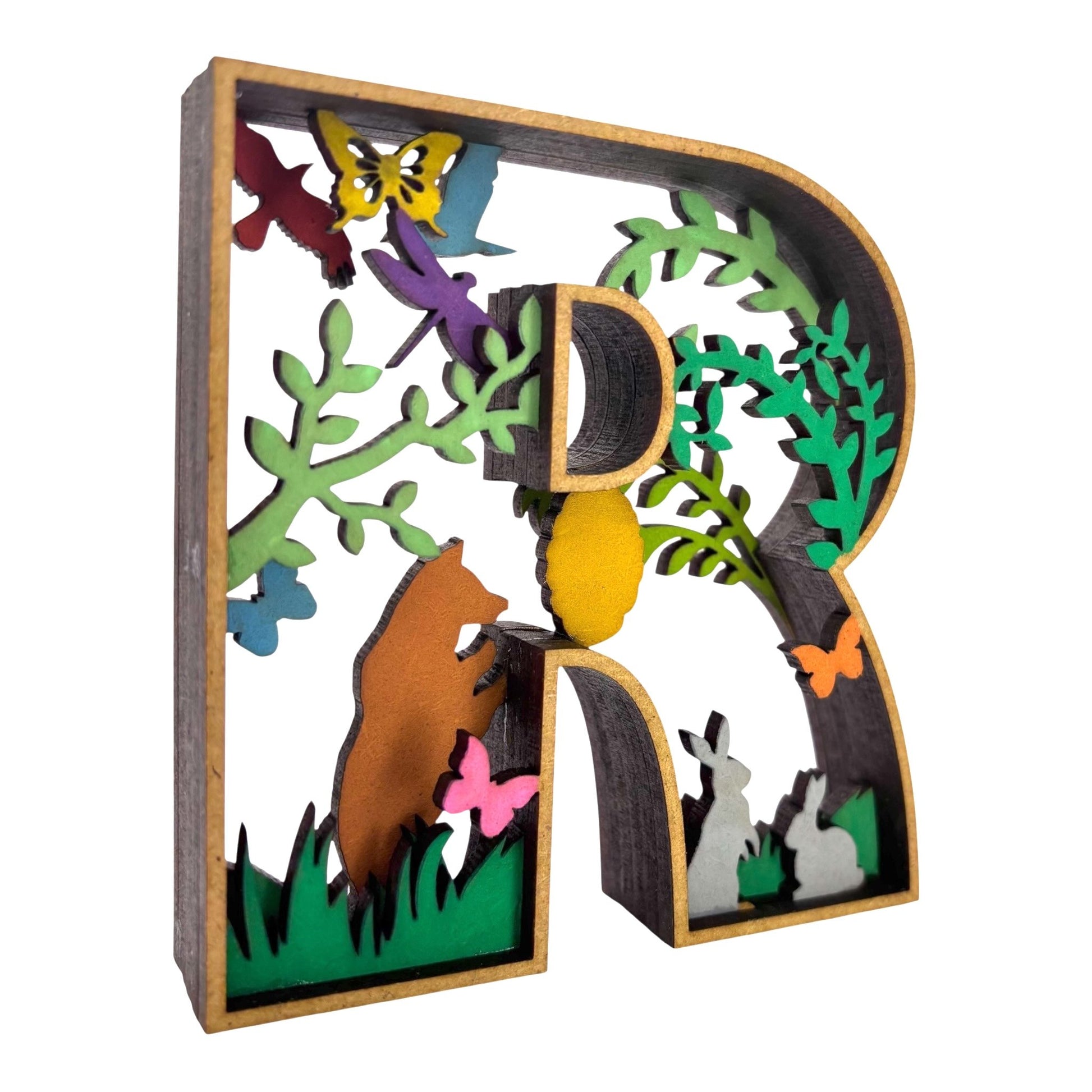 Apportez une touche originale et artistique à votre intérieur avec cette décoration en forme de Lettre "R". Un véritable diorama en 3D, cette lettre comporte un décor intérieur captivant, représentant un paysage avec des animaux. Chaque élément est peint et collé à la main, créant une œuvre unique qui ajoutera charme et personnalité à votre espace.